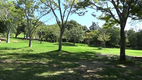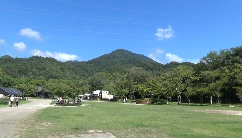 へ。緑の草原の広場。木陰の東屋でちょっと休憩。汗をかいてま