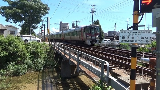 八幡川に近づきました。踏切で電車通過待ち。五日市駅前に到