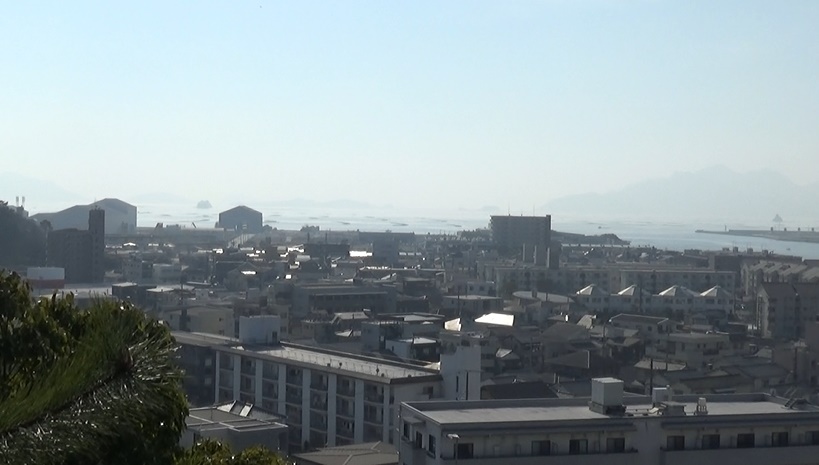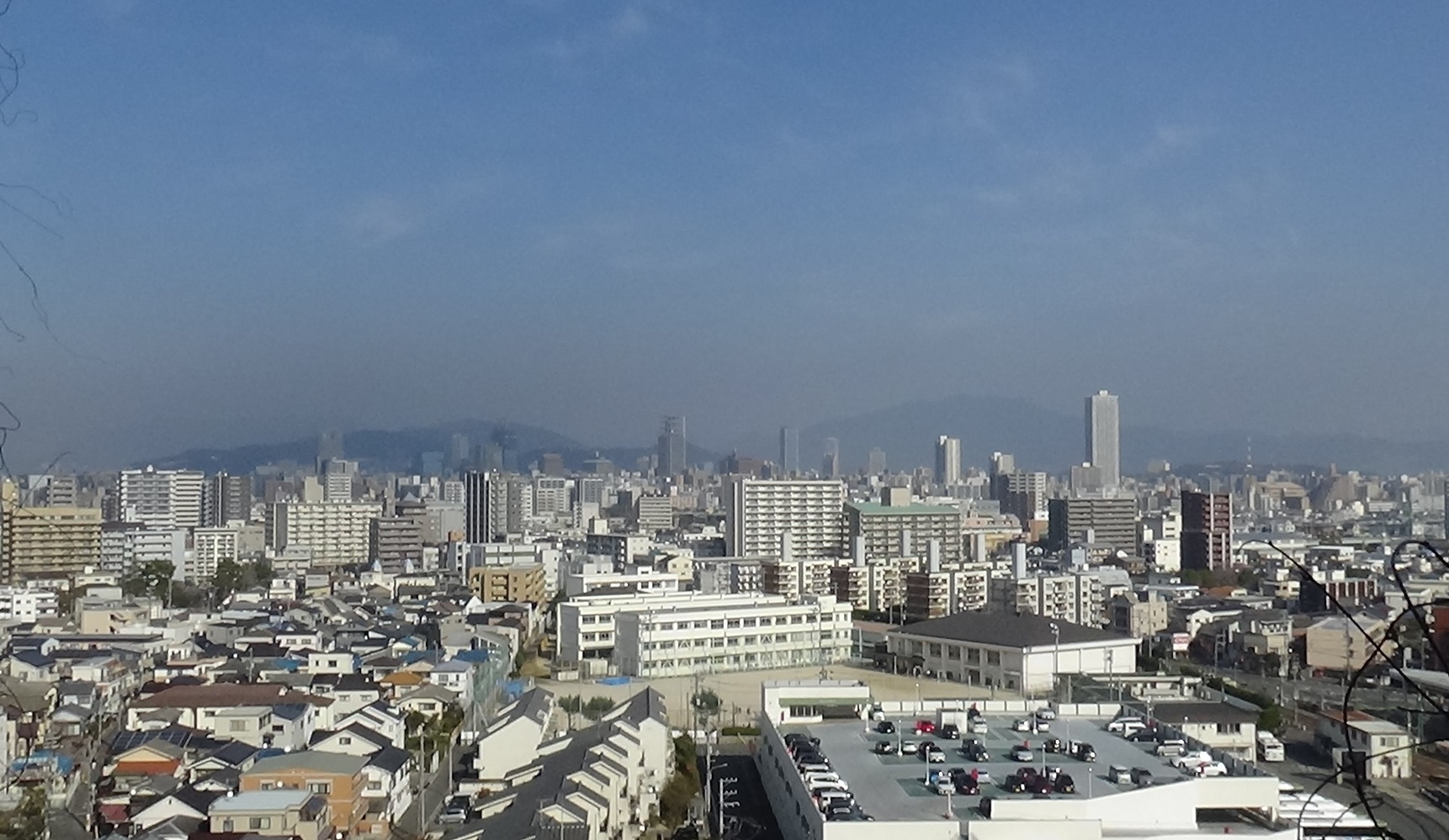 下山時にも車道横から町を眺めました。金網がありますが、年