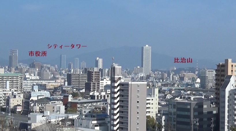 日が順光で当たる北の景色。三角州の町が明るいです。電車が