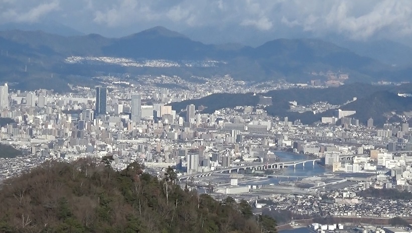 目を左に移して猿猴川や二葉山。奥に火山や武田山が見えてい