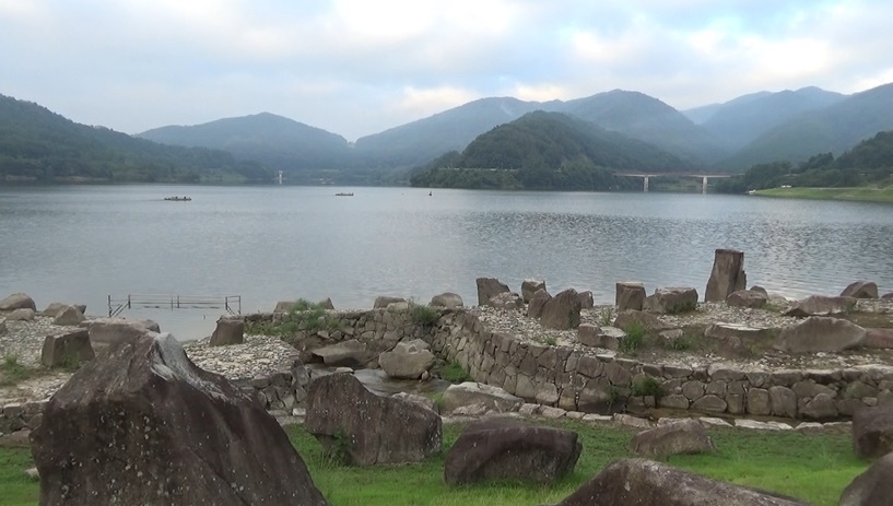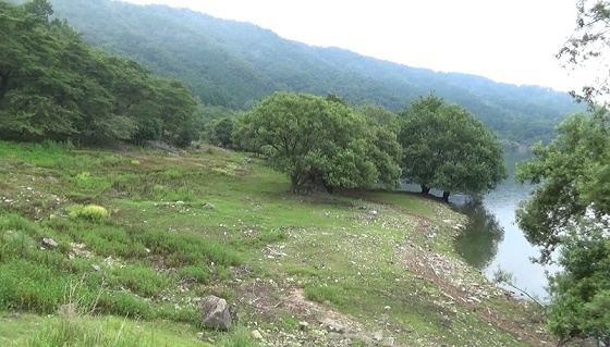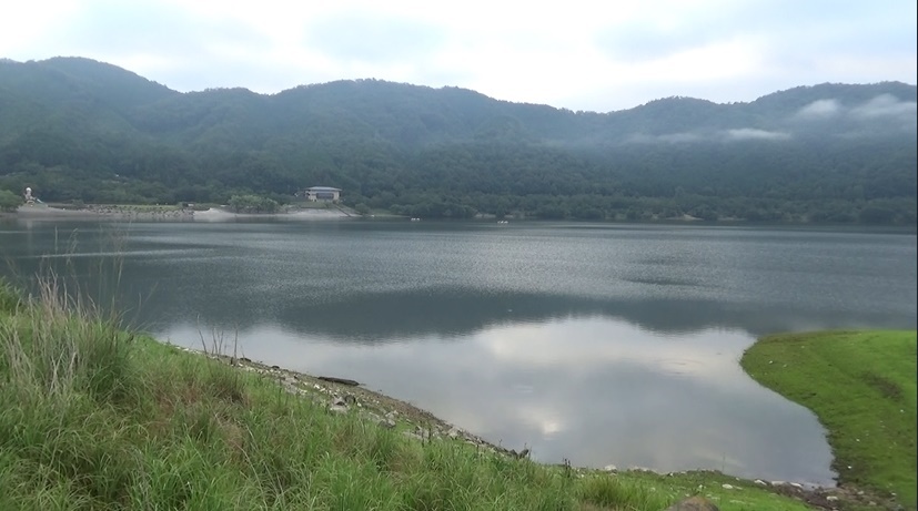 は見られないかも。ダムの下に緑色の草原。中央部に水が流れて
