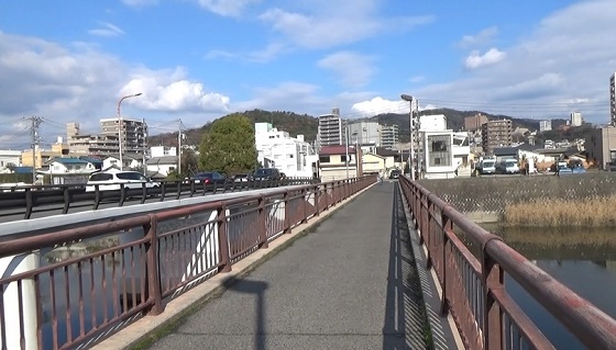 平和公園の噴水を見て相生橋と空鞘橋を渡ります。日が当たる
