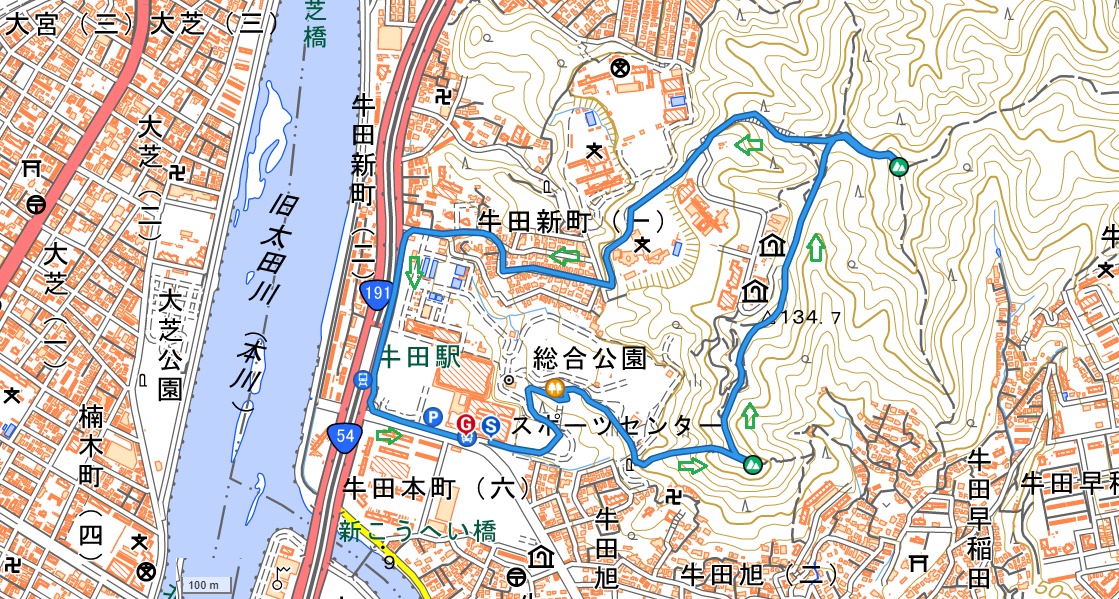 沿いに合流。左手に牛田浄水場を見ながら牛田駅に移動。公園を