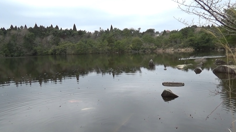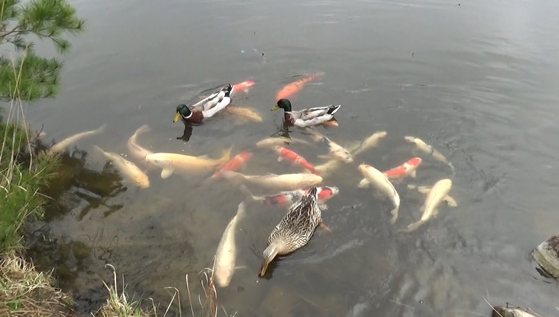 行きました。コイがいたのでエサをあげます。大きい。遠くにカ