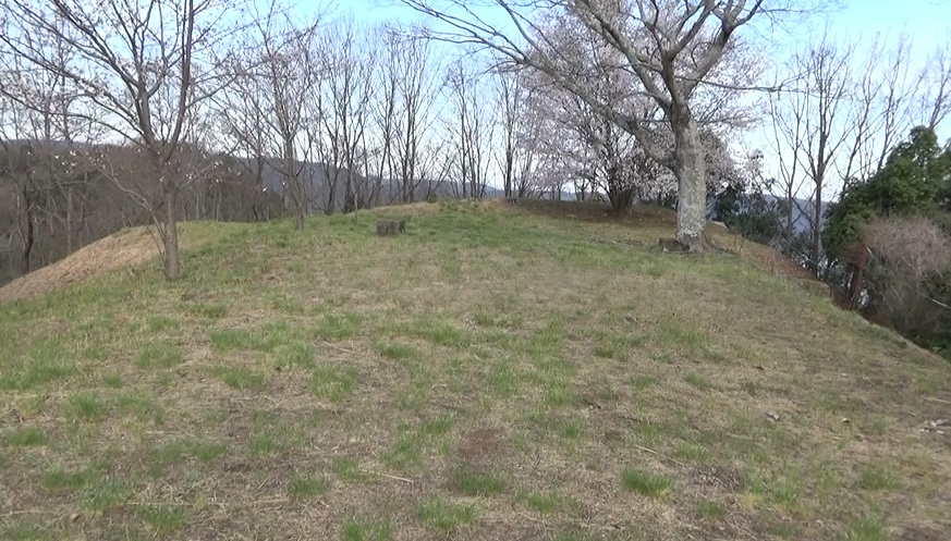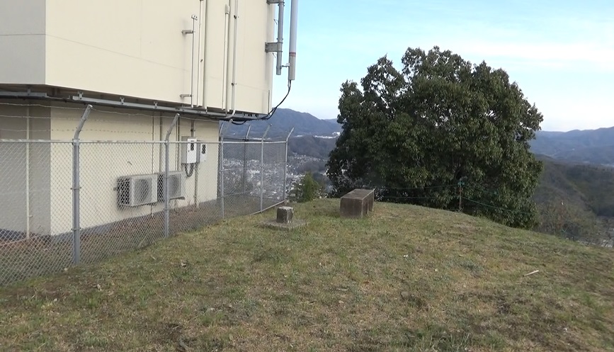 2つの峰の間に相方城跡の説明。毛利氏と戦った山名方の宮氏