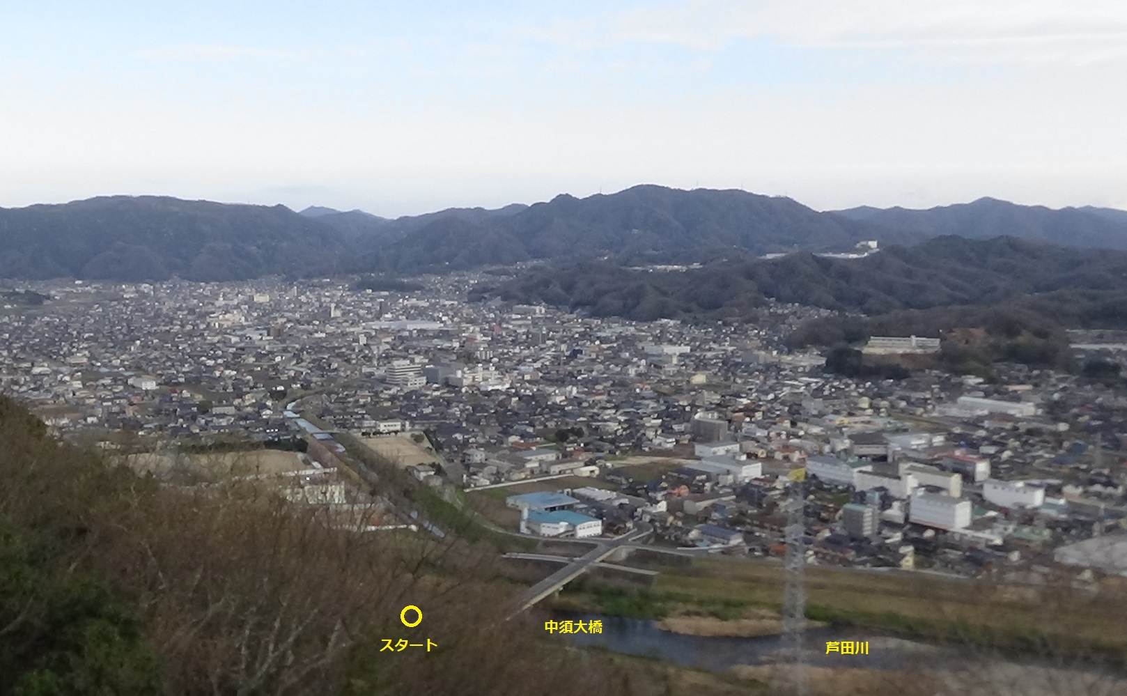 亀ケ岳が見えているはず。スタート地点の中須大橋確認。