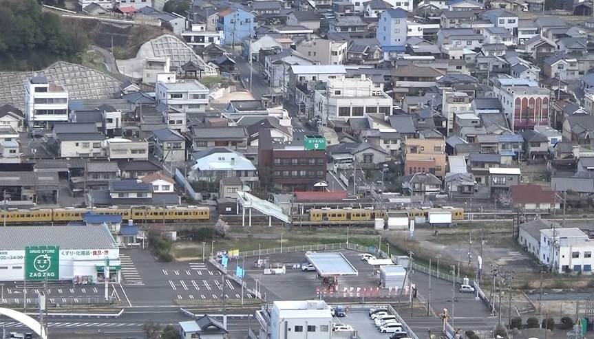 列車の音が聞こえます。新市駅をズーム。黄色い列車が待ち合