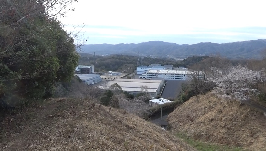 な坂道を上へ。車の道だから広い。展望が開けて工業団地の広い