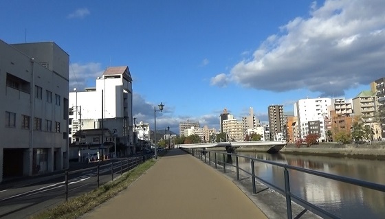 ジアムの横です。上流へ。三篠橋を渡って西土手へ。特にコース