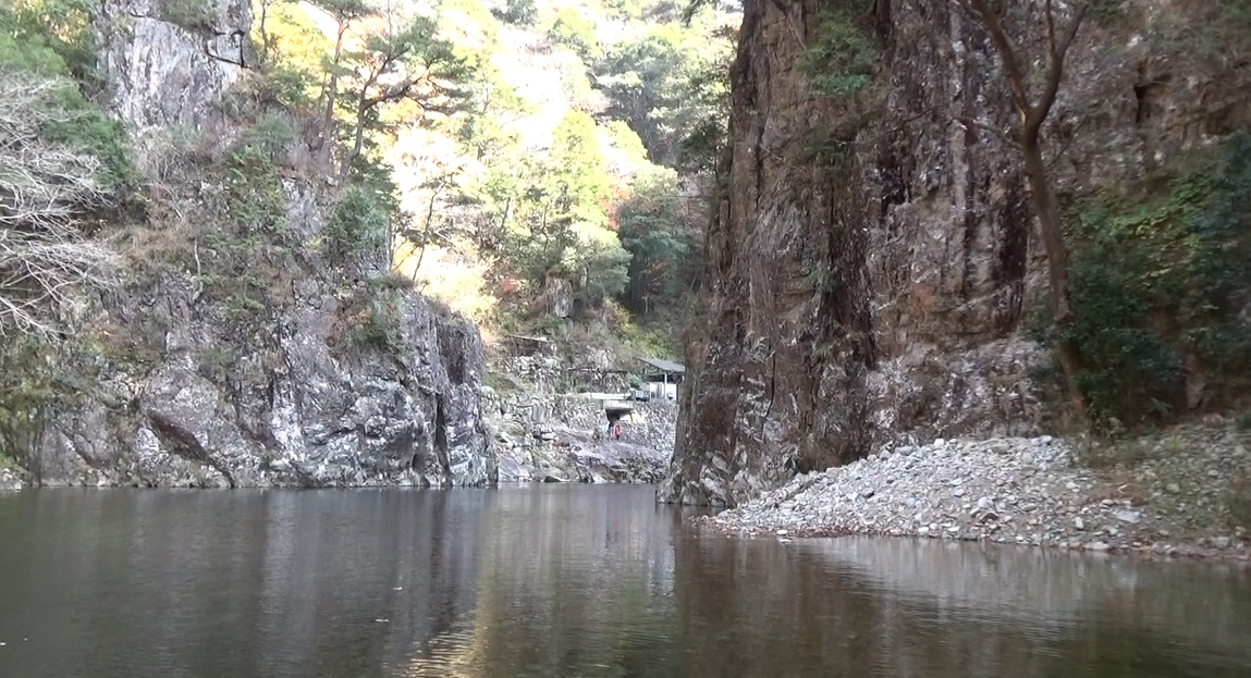 淵。川原に人がいます。山道に入ります。ここに三段峡の景勝碑