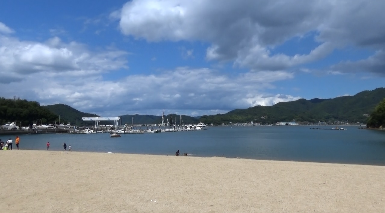 海岸沿いに内浦小学校に向かっています。浜辺が広がっている