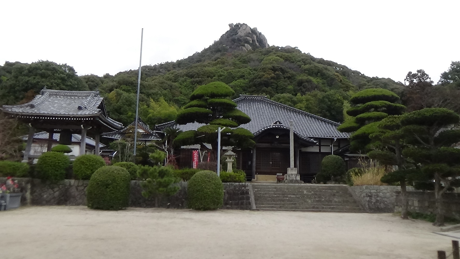 つ本堂の前へ。見上げると石船山が見事。174mの前山。境内
