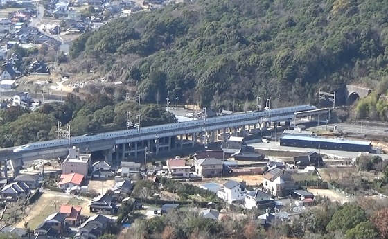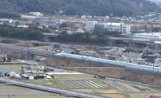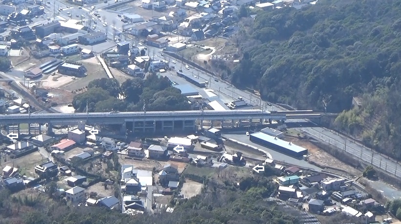 えます。新幹線が目に入りました。山道のような筋が見えるけど、