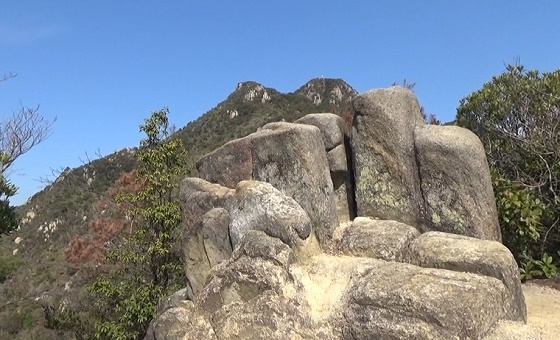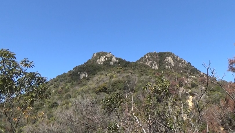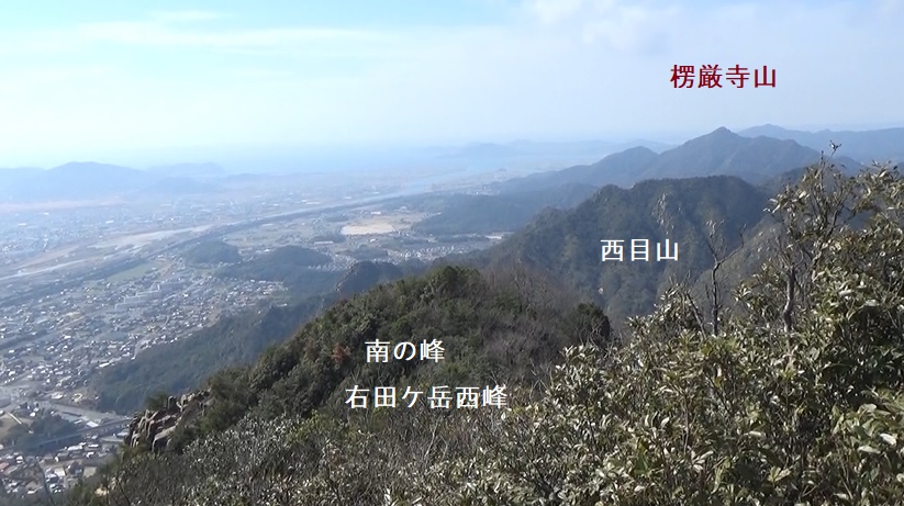 正面に西峰(南の峰)と右田ケ岳の山頂が見えます。灰色の岩