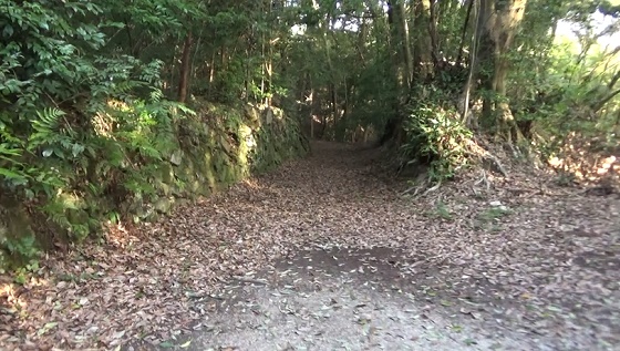 左に続く石積を見て、棒を回しながら歩いてます。早く車道に